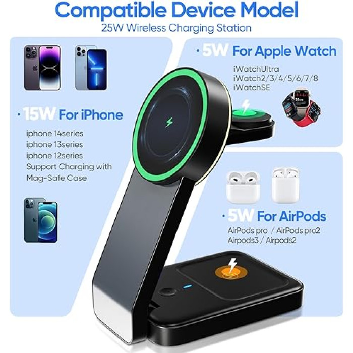 • Magnetic Wireless Charging Station makes wireless charging a breeze with its new improved magnetic technology! The up to 15W safe magnetic wireless charging pad is perfectly compatible with iPhone 15, iPhone 15 Pro, iPhone 15 Plus, iPhone 15 Pro Max, iPhone 14, iPhone 14 Pro, iPhone 14 Plus, iPhone 14 Pro Max, iPhone 13, 13 Pro, 13 Pro Max, 13 minis; iPhone 12, 12 Pro Max, 12 minis, as well as AirPods 3/Pro/Pro 2. Note: Use Mag-Safe case for stronger magnetization, regular cases will weaken magnetic absorption.