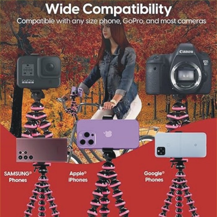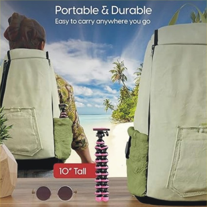 • Cell Phone Tripod Stand – This flexible phone stand is ideal for taking selfies, vlogging, makeup tutorials, social media live streaming and recording. Our phone tripod mount features flexible legs that hold firm with an adjustable universal phone holder.