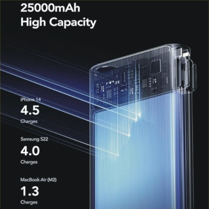 The 25000mAh Portable Laptop Charger with Built-in Cables is a high-capacity, versatile power bank designed to meet the needs of modern laptops and other devices. With its substantial 25000mAh battery, it offers extended power on the go, making it ideal for travelers, remote workers, and anyone needing reliable backup power. The charger features multiple built-in cables, eliminating the need to carry extra cords. It supports 100W Power Delivery (PD) and Programmable Power Supply (PPS), ensuring fast and efficient charging for a wide range of laptops, smartphones, tablets, and other USB-C devices. Compact and robust, this power bank is engineered for convenience and durability, making it a perfect companion for your tech essentials.